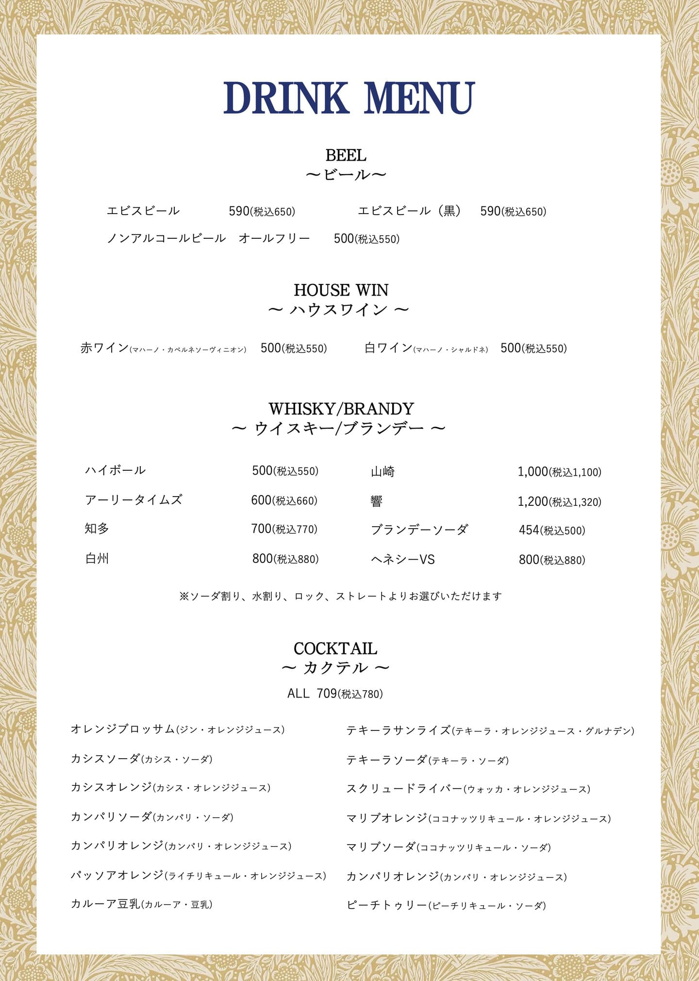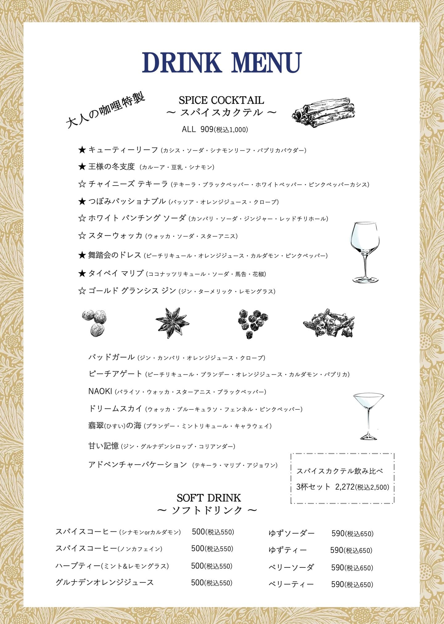定番のビール、ハウスワイン。そして、ウイスキーを豊富に取り揃えております。さらに、大人の咖哩でしか飲めない「スパイスカクテル」もご用意しております。大人な時間をゆったりとお過ごしください。